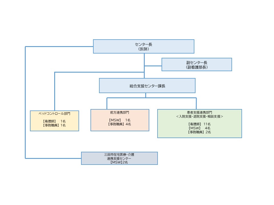 地域医療機関からの受診、検査予約、各種問い合わせに対する「前方連携部門」、患者さんが安心して当院で入院し、早期退院に向けての説明・相談の対応、外来通院中の患者さんや在宅療養をされている患者さんが地域で療養できるよう相談に対応させていただく「患者支援連携部門」、緊急入院の受入や入院期間の適正な管理を行う「ベッドコントロール部門」の3部門体制となりました。