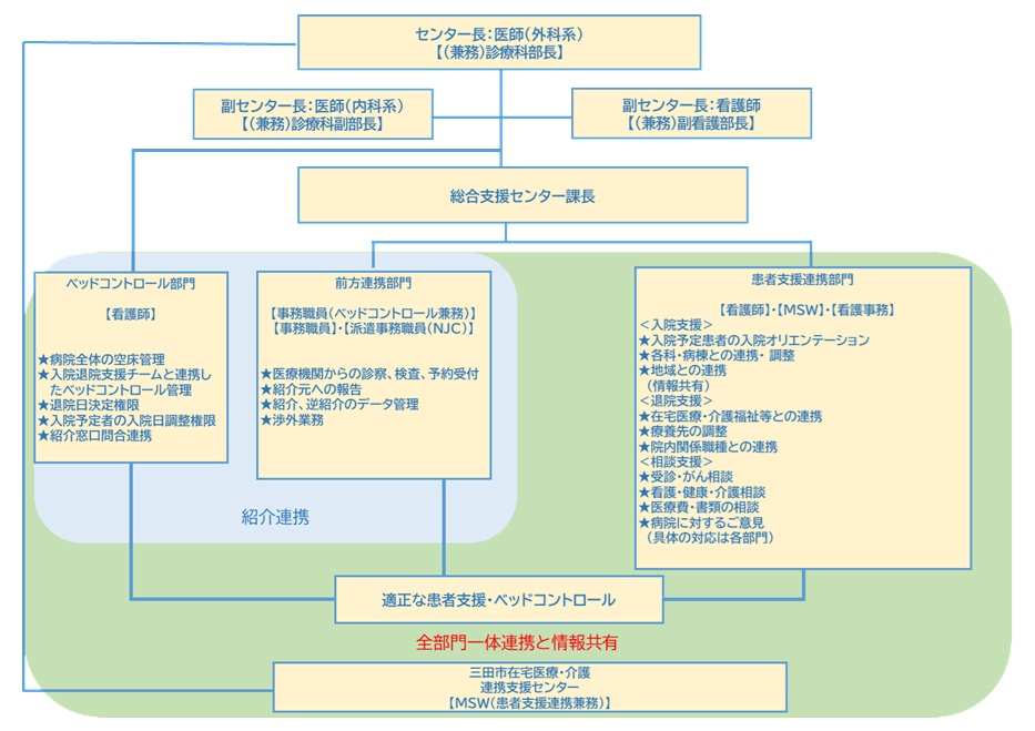 地域医療機関からの受診、検査予約、各種問い合わせに対する「前方連携部門」、患者さんが安心して当院で入院し、早期退院に向けての説明・相談の対応、外来通院中の患者さんや在宅療養をされている患者さんが地域で療養できるよう相談に対応させていただく「患者支援連携部門」、緊急入院の受入や入院期間の適正な管理を行う「ベッドコントロール部門」の3部門体制となりました。